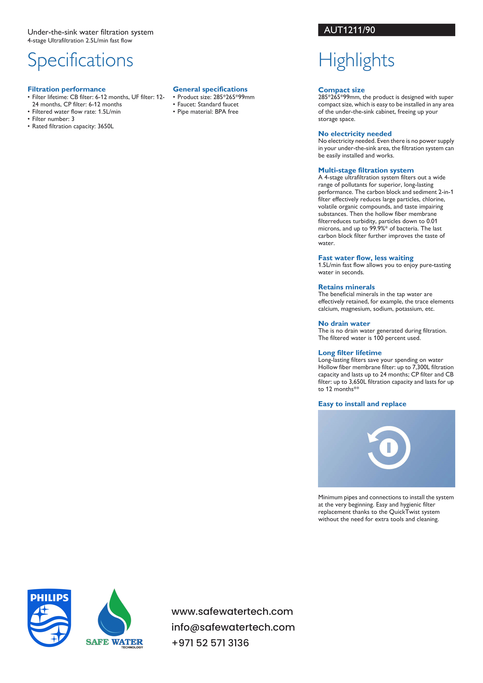 The Philips AUT1216 is a compact under-the-sink water filtration system designed to provide clean, safe, and great-tasting drinking water. It uses advanced multi-stage filtration to reduce sediment, chlorine, odor, and other impurities while retaining essential minerals. The space-saving design fits neatly under the sink and works without electricity, ensuring reliable daily use.